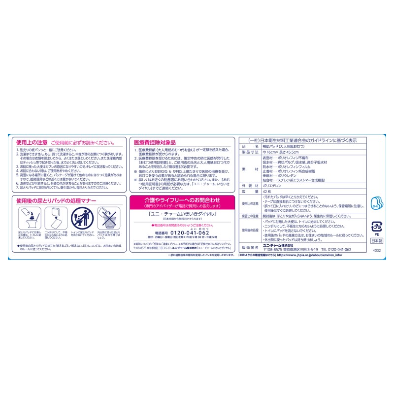 - ●表面材…ポリオレフィン不織布●吸水材…綿状パルプ、吸水紙、高分子吸水材●防水材…ポリオレフィンフィルム●止着材…ポリオ