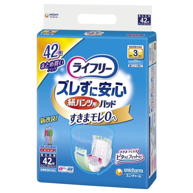 ●紙パンツ用パッドならズレ止めテープ搭載で吸収体が変形しフィットするからスキマができずにモレ安心。
