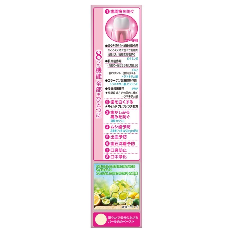 ●薬用成分…硝酸カリウム、ポリリン酸Na、フッ化ナトリウム(フッ素として1450ppm)、酢酸トコフェロール(ビタミンE