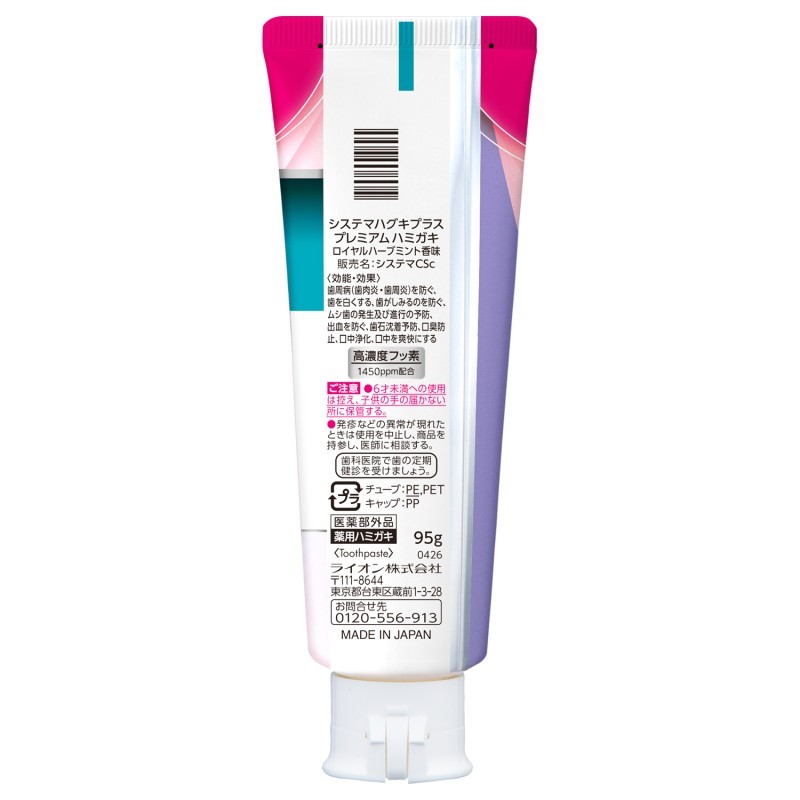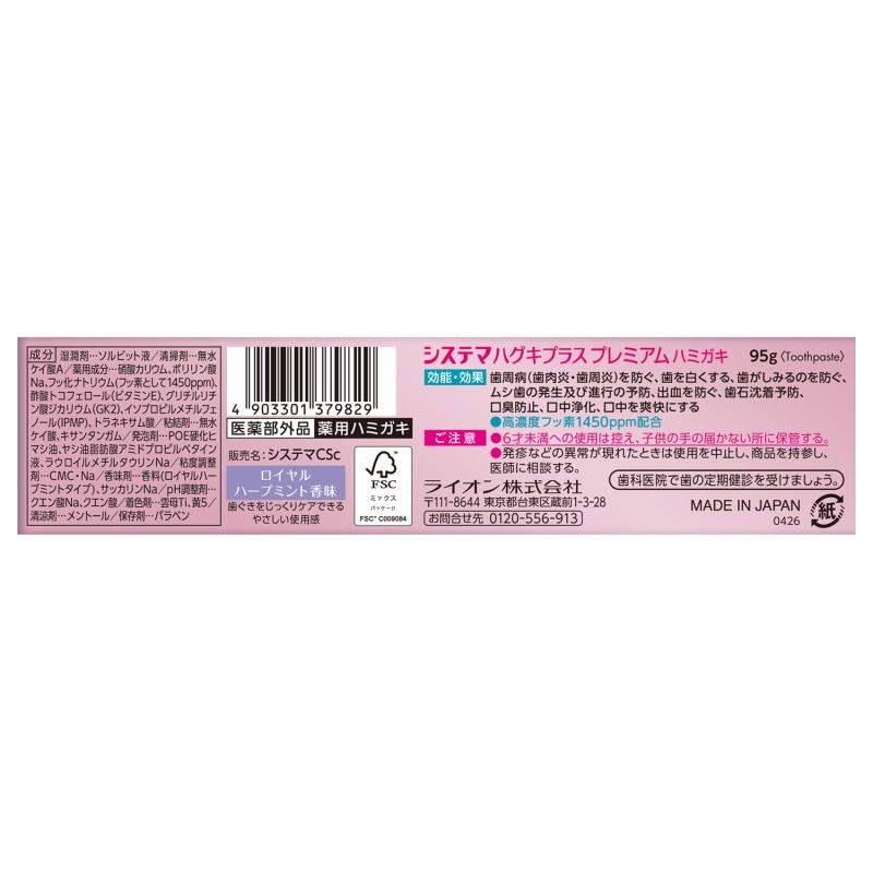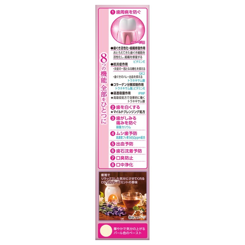 ●薬用成分…硝酸カリウム、ポリリン酸Na、フッ化ナトリウム(フッ素として1450ppm)、酢酸トコフェロール(ビタミンE
