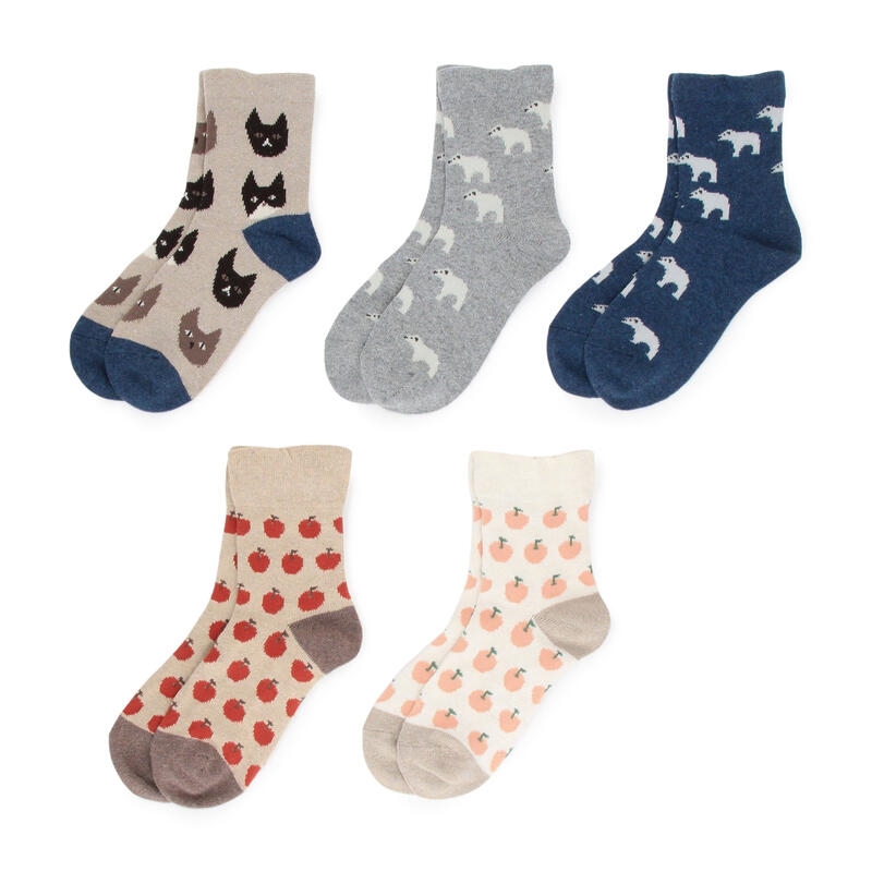 ポップなシロクマ、猫、リンゴの柄が5足入ったお買い得商品です。