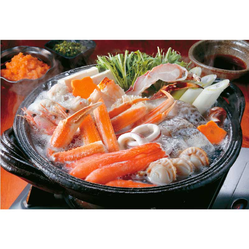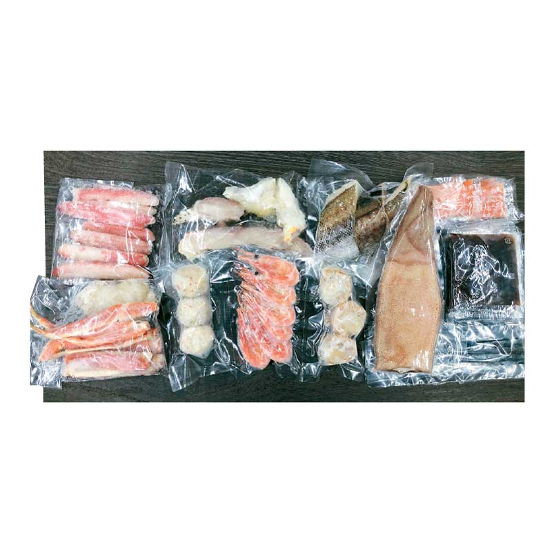 ゆでずわいがにカット150g、生たらばがにカット100g、生ずわいがに棒ポーション100g、ボイル海老×6、