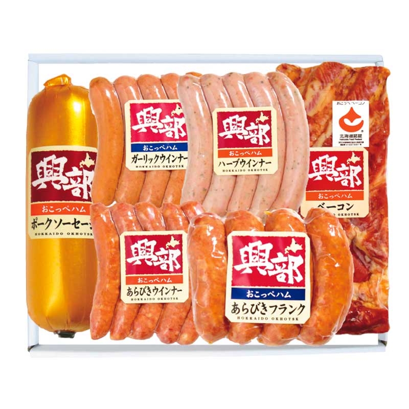 北海道認証ベーコンブロック300g、あらびきフランク200g、あらびきウインナー110g、