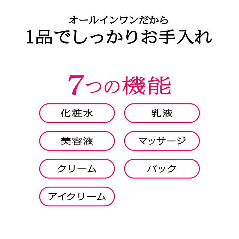 7つの機能(化粧水・乳液・美容液・マッサージ・クリーム・アイクリーム・パック)がひとつになった大人のオールインワン。