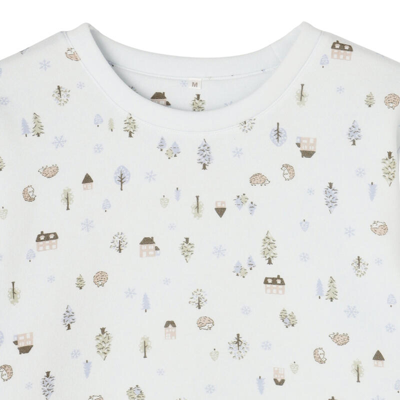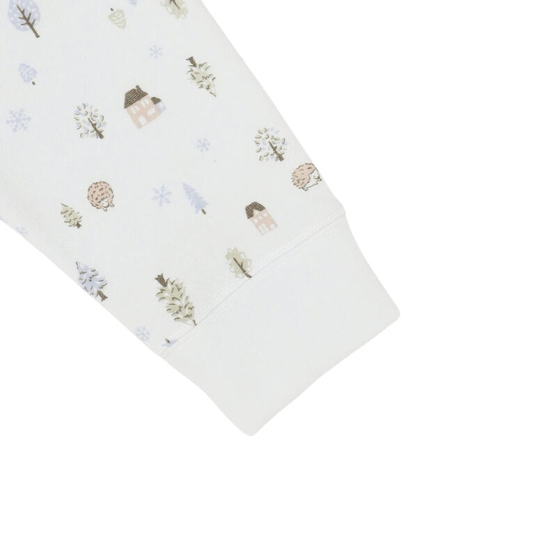 雪と森のハリネズミをのチーフにした総柄プリントの上着と無地パンツの組み合わせ。