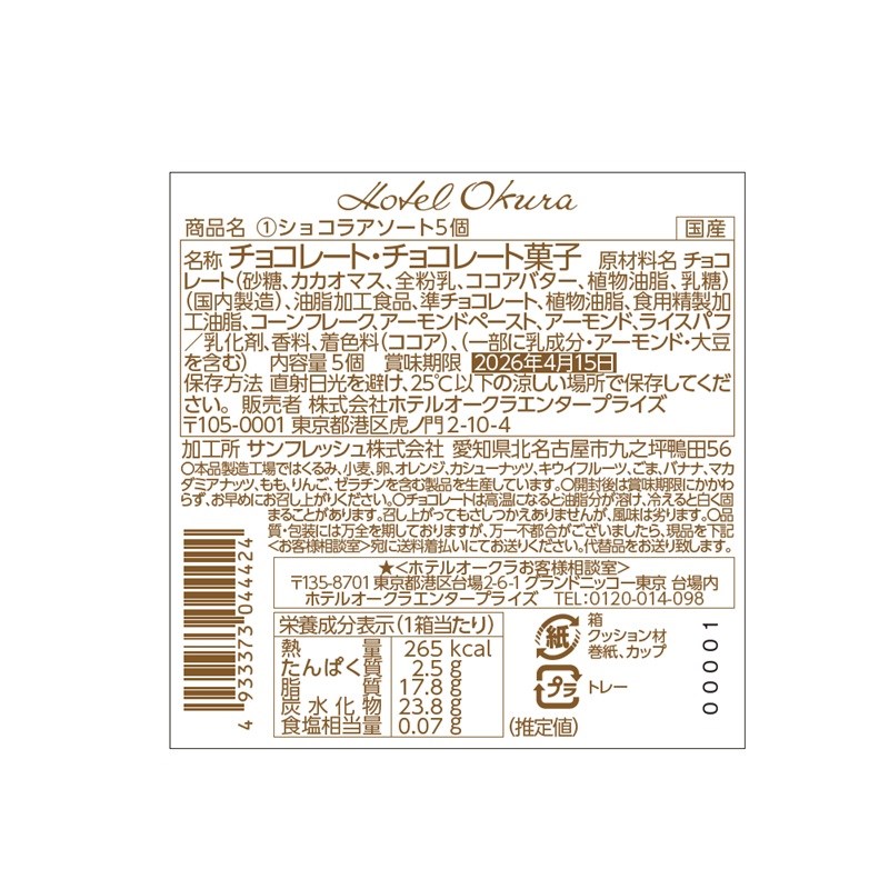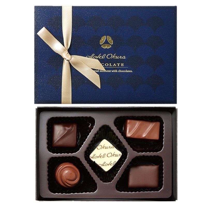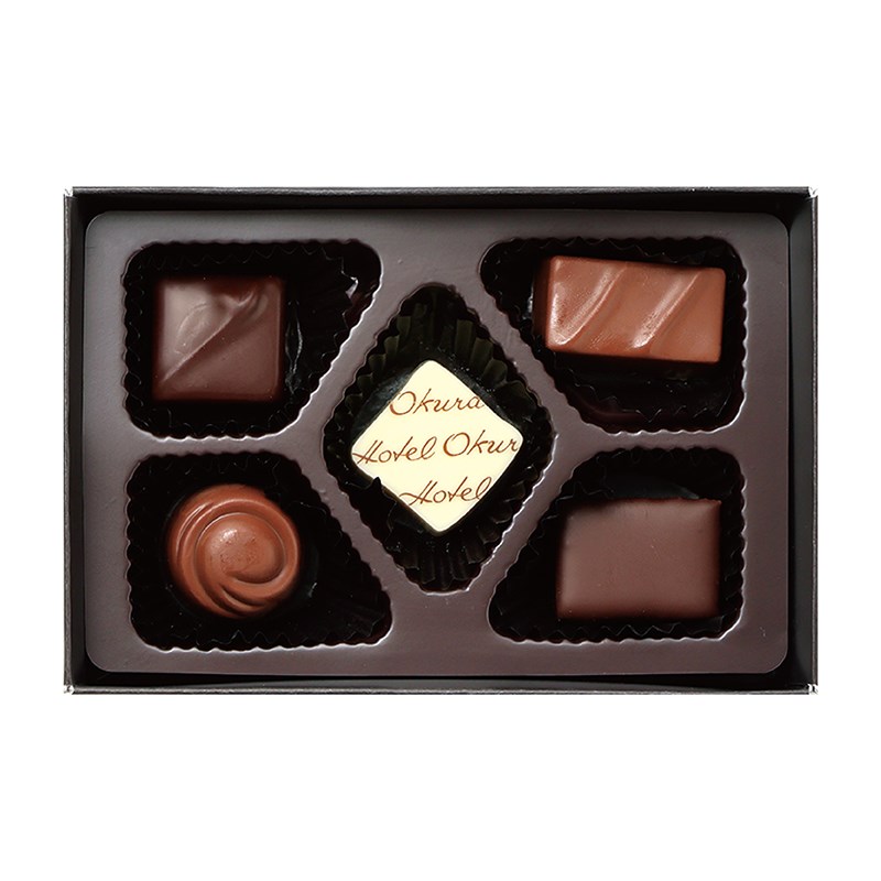 アーモンドを使用したショコラや、ロゴがプリントされたホワイトショコラ等の詰め合わせ。