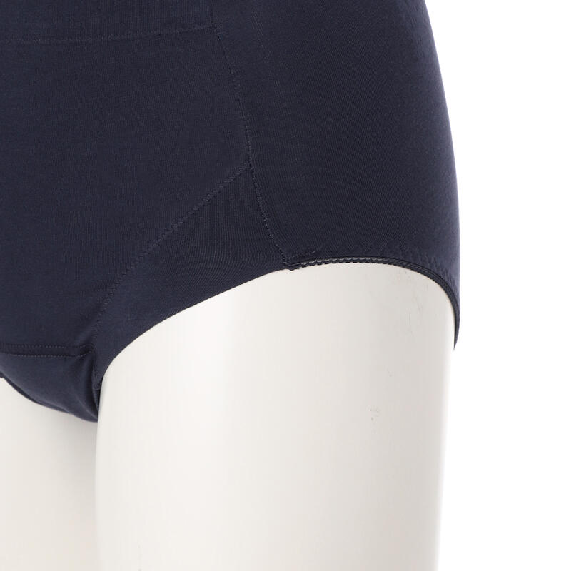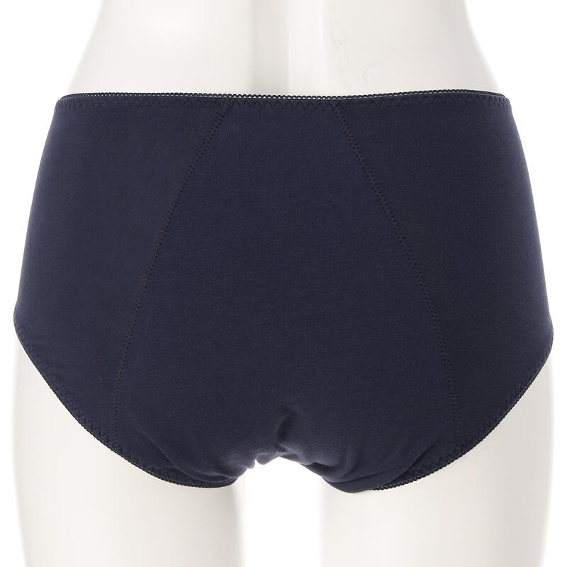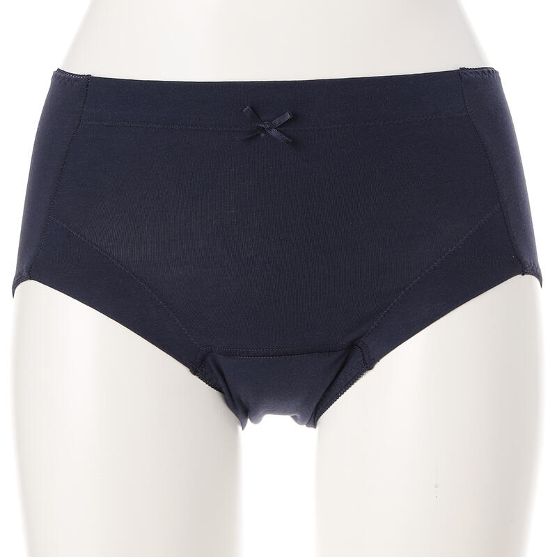 夜間や多い日用のサニタリーショーツ。羽付きナプキン対応、深履きで安心感のあるシルエット。