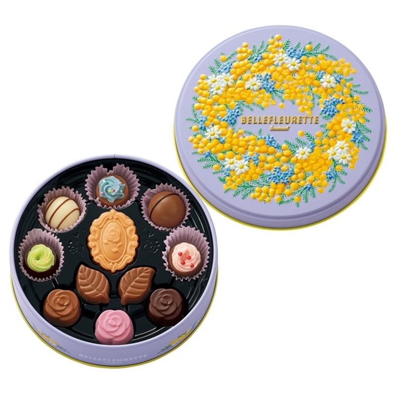 春の花をイメージしたエンボス加工の丸缶に、小さいカップケーキ型チョコレートなど
