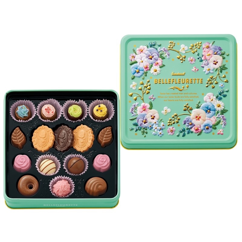 「春」「花」をイメージしたパッケージの四角缶に、様々なチョコレートを16個詰め合わせました。