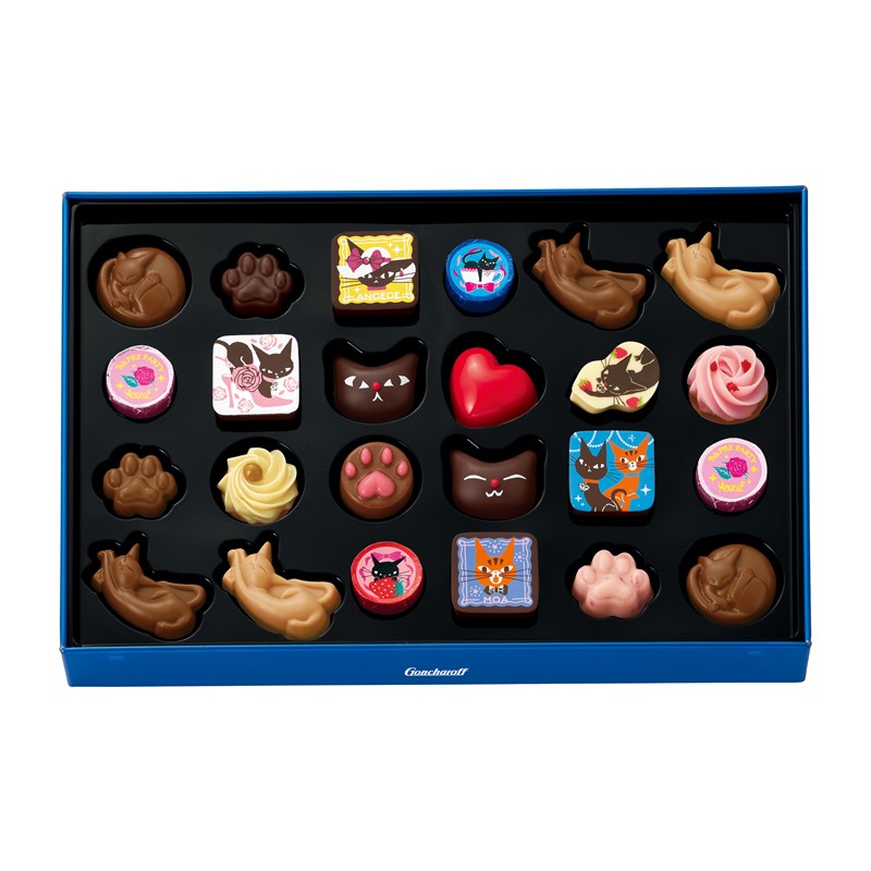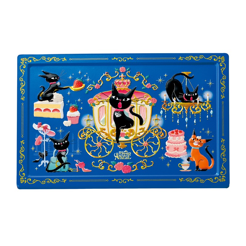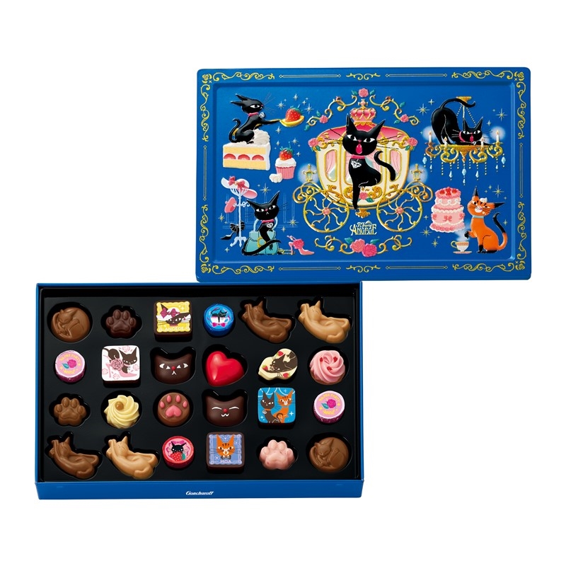 プレパーティーのようすを描いた缶に、プリントチョコレートや猫型チョコレート、