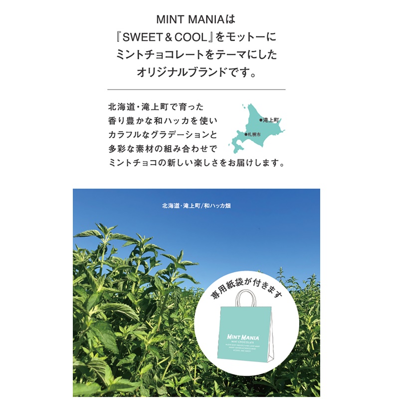 北海道・滝上町で育った香り豊かな和ハッカを使用し、ミントチョコの新しい楽しさをお届けします。