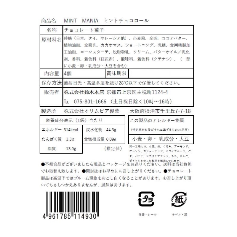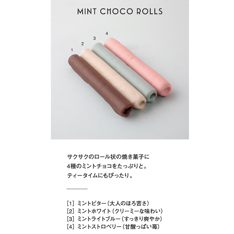 ロール状の焼き菓子に4色のミントチョコレートを巻いて仕上げました。