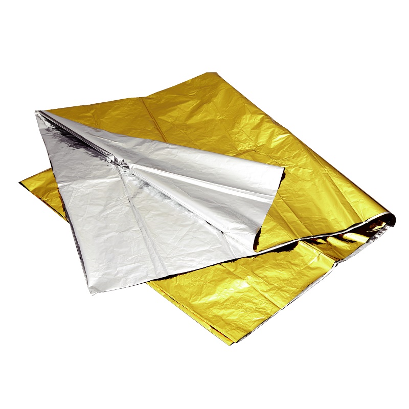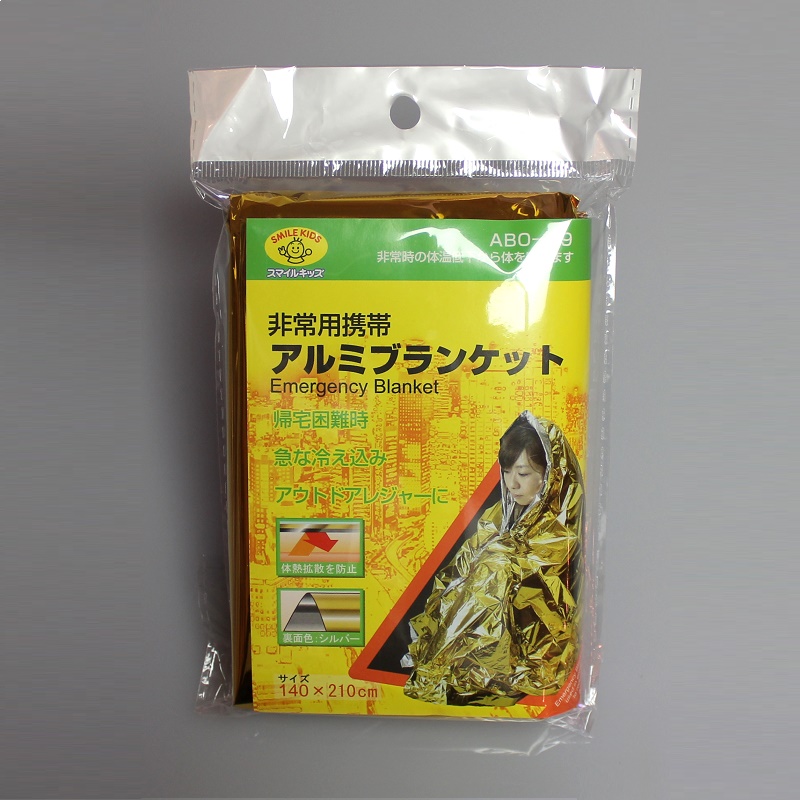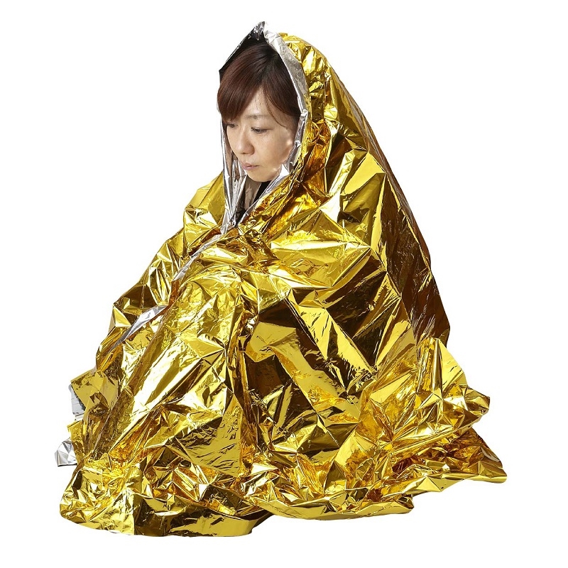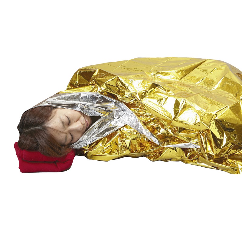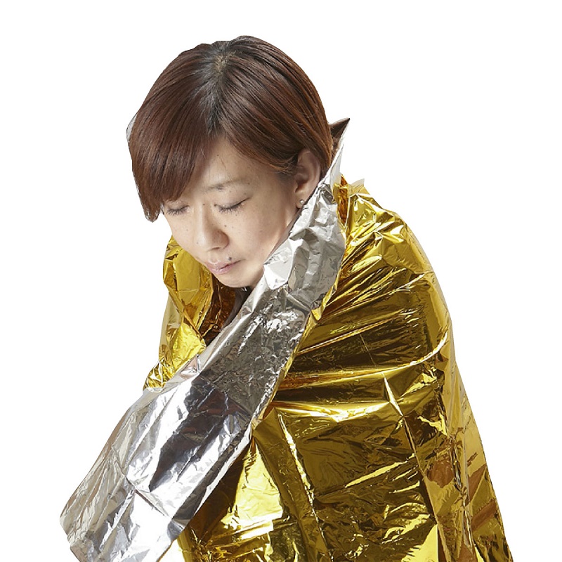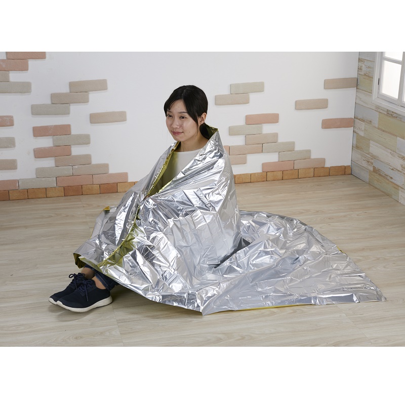 軽量コンパクトなアルミ蒸着 ポリエステルの緊急用アルミブランケット。災害時の防寒用や毛布に。