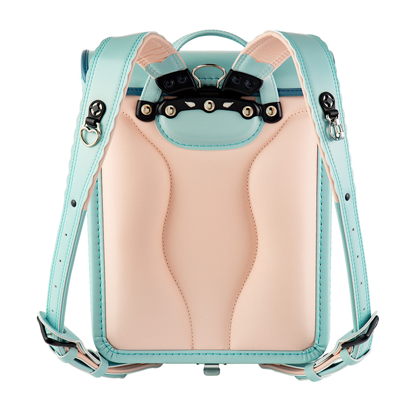 1-4.「ブレスレザー」・・・背あてと肩ベルト、下ベルト裏に吸湿と放湿を繰り返す合成皮革「ブレスレザー」を採用。