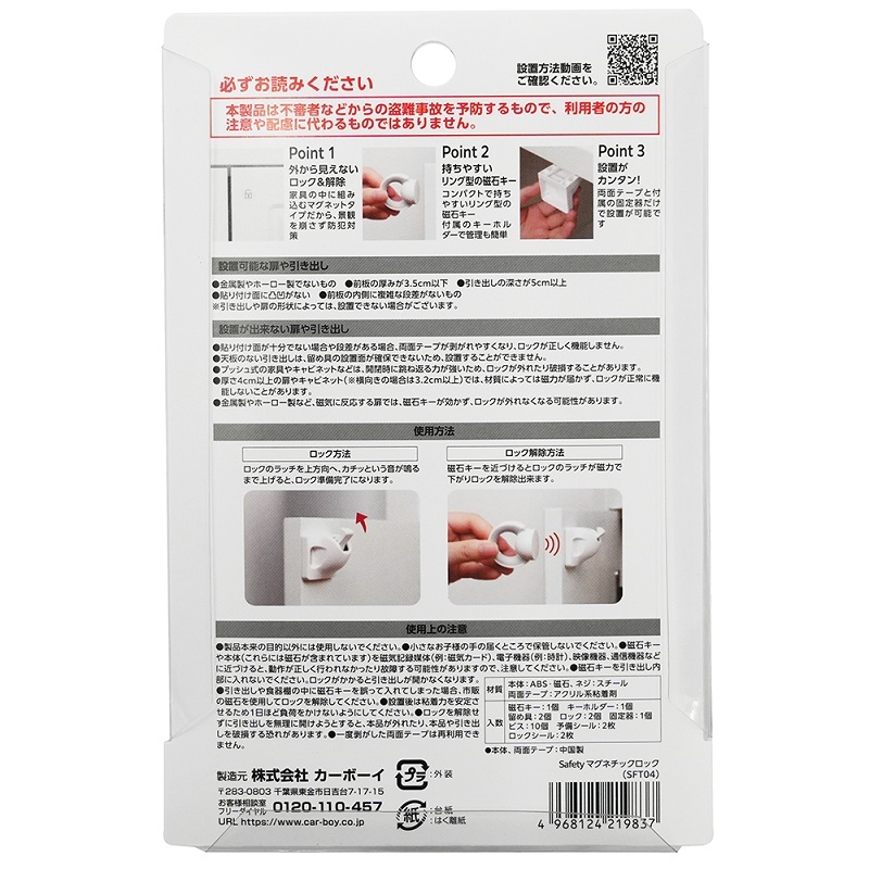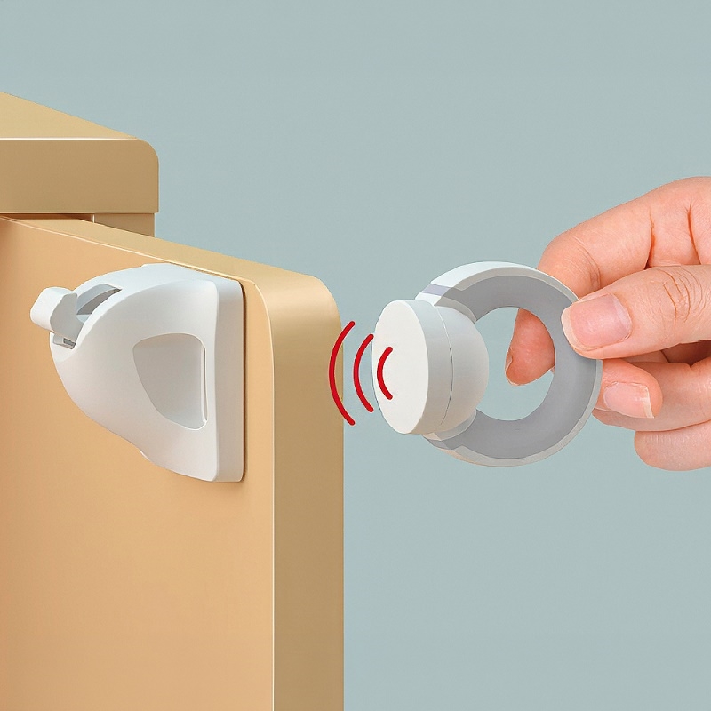 見えないところでしっかりロック。マグネット式のロックで守る。不審者などからの盗難事故を予防、お子様やペットのいたずら、地震などの対策に。
