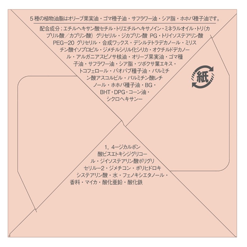 シリル化シリカ、オクチルドデカノール、アルガニアスピノサ核油、オリーブ果実油、ゴマ種子油、サフラワー油、シア脂、ツボクサ