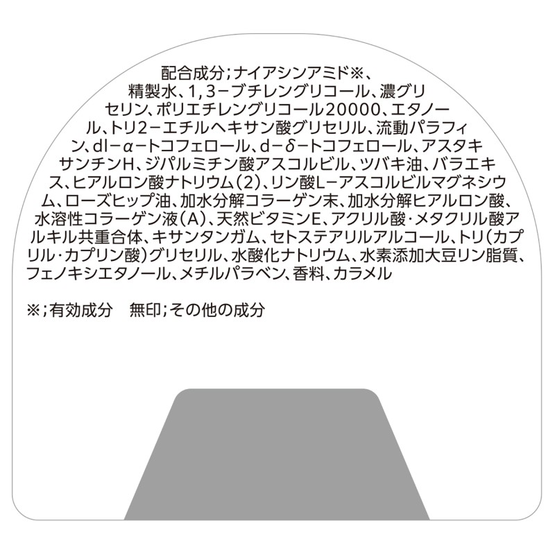 ミチン酸アスコルビル、ツバキ油、バラエキス、ヒアルロン酸ナトリウム(2)、リン酸L-アスコルビルマグネシウム、ローズヒッ