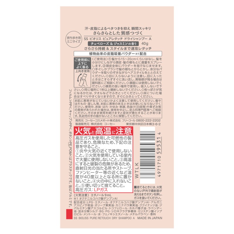 - LPG、エタノール、オクテニルコハク酸デンプンAl、アルガニアスピノサ核油、オリーブ果実油、カニナバラ果実油、ククイナッ