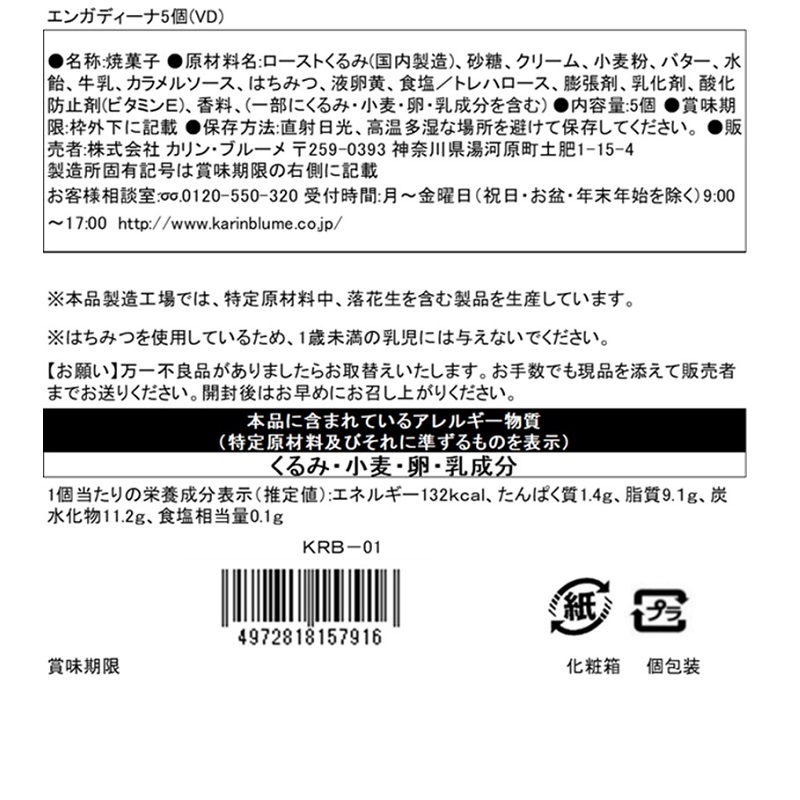 くるみとキャラメルをサンドしたヨーロッパ伝統のお菓子エンガディーナです。5個入