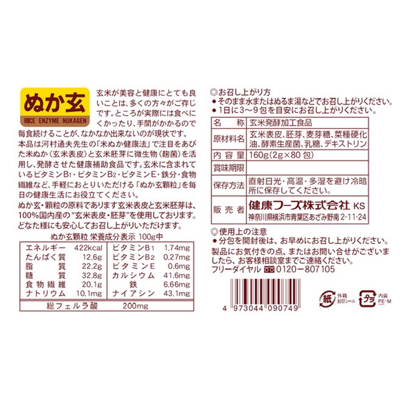 「デキストリン」をプラスした「ぬか玄顆粒」小分け分包タイプの健康補助食品。