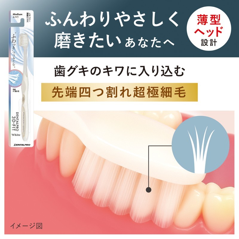 ●White…テーパー毛がさらに4つに割れることで、細く、きめ細かい毛先に。歯グキのキワに入り込み、やさしい使用感を実現