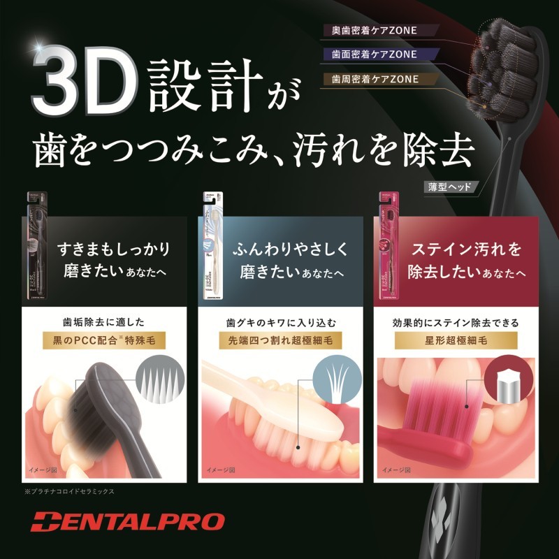 ●密毛植毛…従来の歯ブラシを約5倍の毛を植毛。歯面への密着度が上がり高い歯垢除去力を実現。