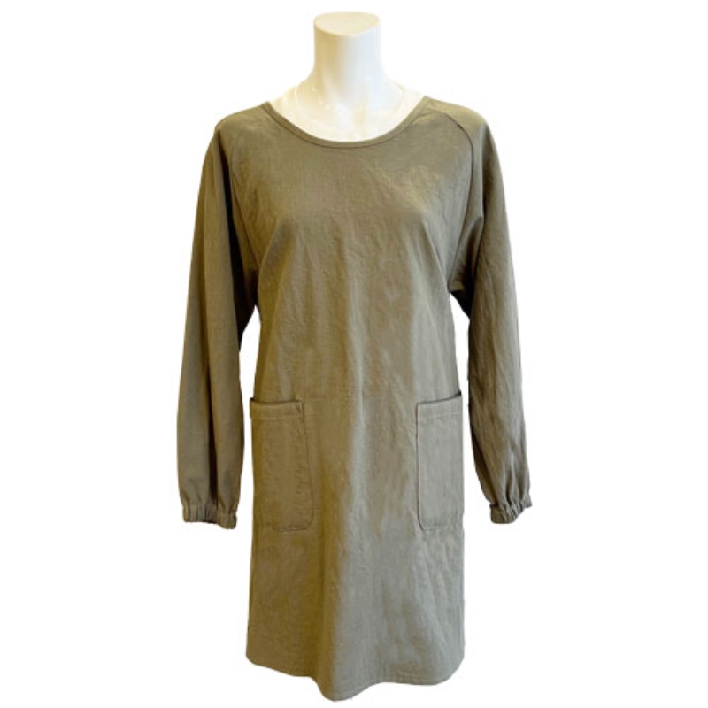 袖の付いたかっぽう着のデザインです。袖をまくり上げても落ちにくいゴム付き仕様です。