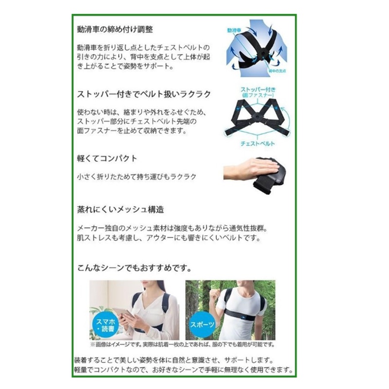 肩ベルトとチェストベルトの引く力が肩甲骨を引き寄せ、後方へ働くことで、上体がピンと起き上がります。