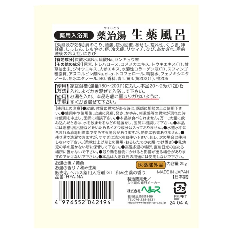 - ●有効成分…炭酸水素Na、硫酸Na、センキュウ末●その他の成分…尿素、トレハロース、コメヌカエキス、トウキエキス(1)、