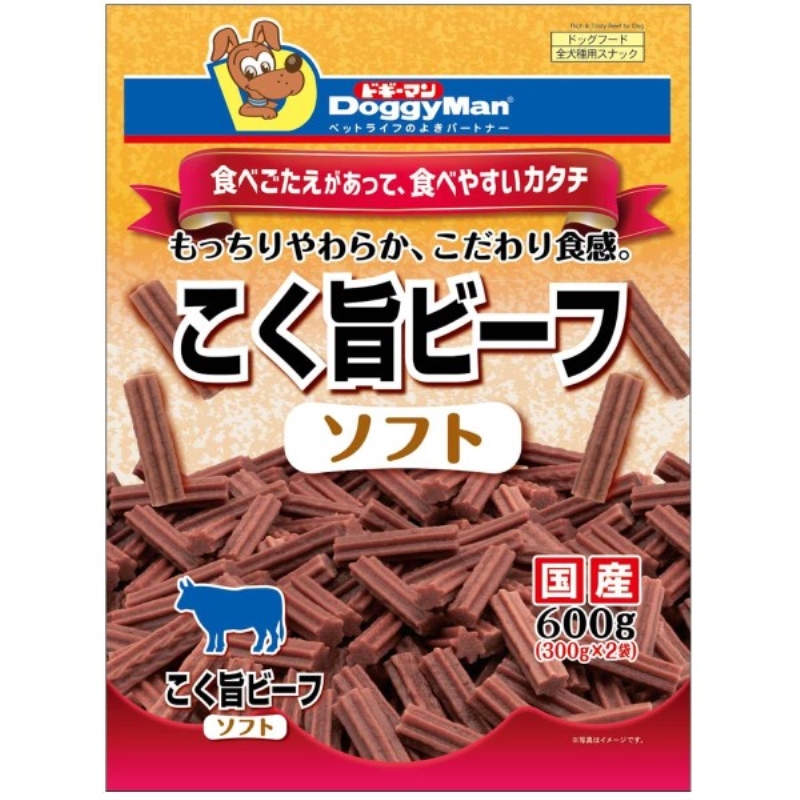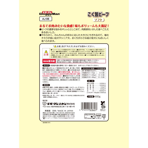 - 肉類(牛肉、鶏肉)、小麦粉、脱脂大豆、糖類、ソルビトール、グリセリン、ミネラル類(ナトリウム)