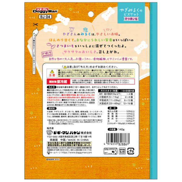 - 小麦粉、ヤギミルク、さつまいも、糖類、植物油脂、コーンスターチ、チコリ抽出物(食物繊維、オリゴ糖含有)、膨張剤