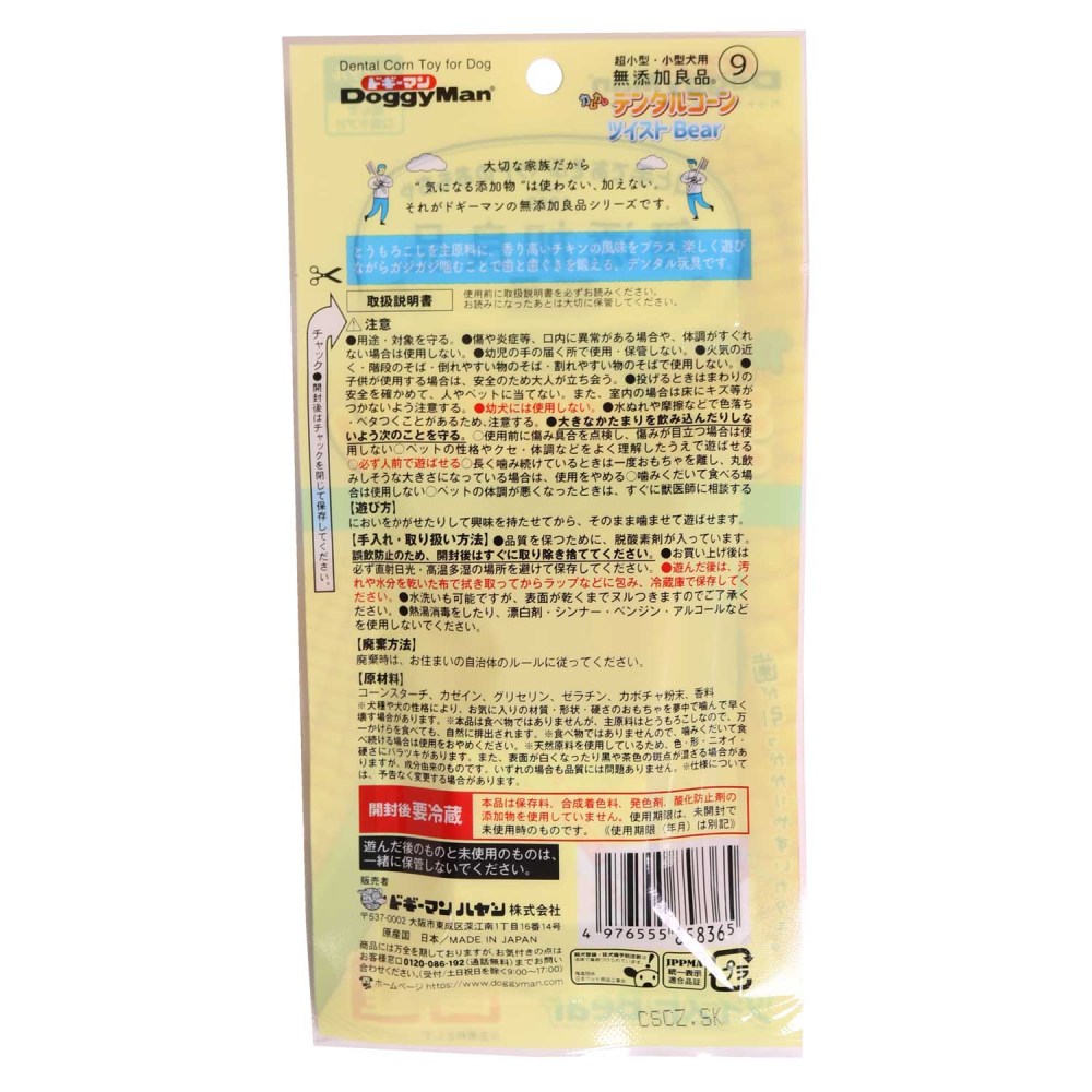 ・とうもろこしを主原料に、香り高いチキン風味をプラスしたデンタル玩具です。