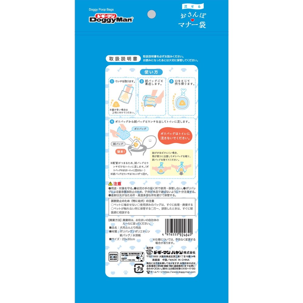 手を汚さないポリバッグと、トイレに流せる紙バッグを組み合わせた2層構造のおさんぽマナー袋。