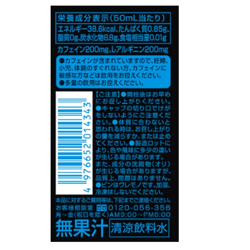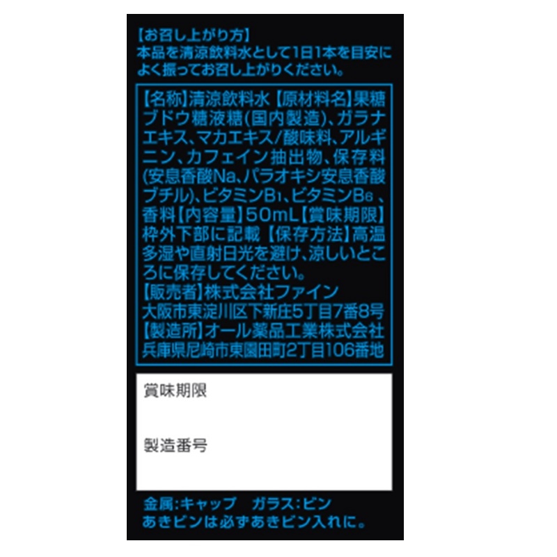 - 果糖ブドウ糖液糖(国内製造)、ガラナエキス、マカエキス/酸味料、アルギニン、カフェイン抽出物、保存料(安息香酸Na、パラ