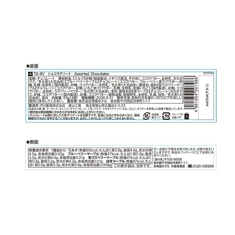 カラーボックスに帝国ホテルのロゴを箔押しし、4種の粒チョコレートを詰合わせました。