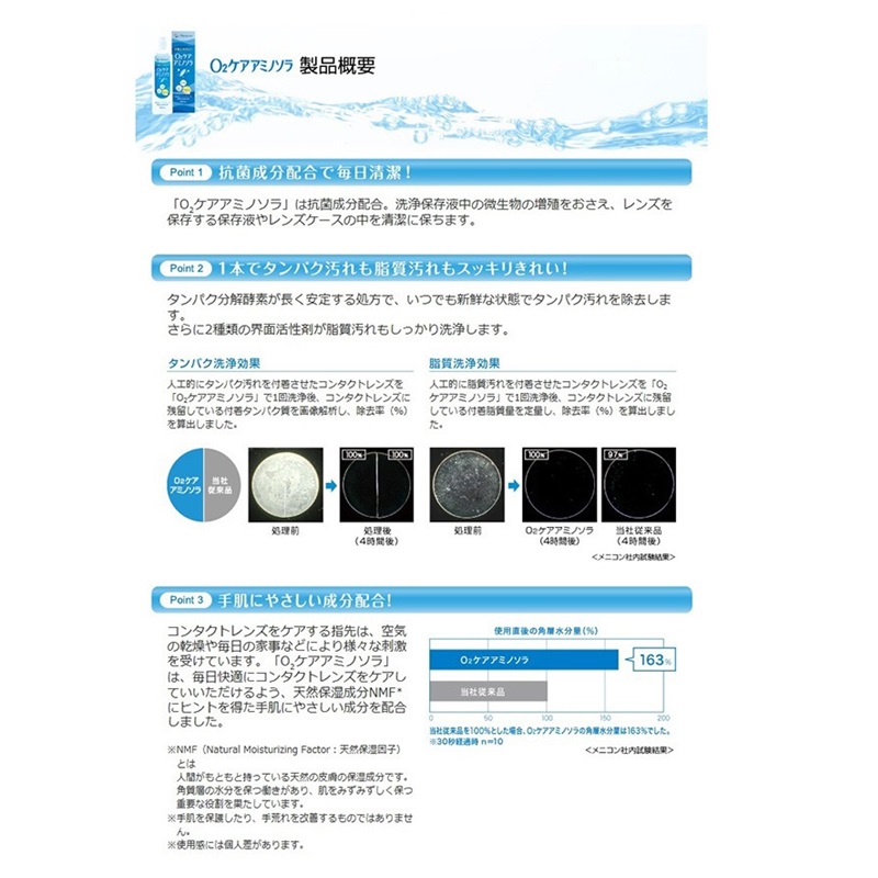 皮膚の水分を保持する天然保湿因子(NMF)にヒントを得て、コンタクトレンズをケアする手肌にやさしい成分(アミノ酸・乳酸ナ