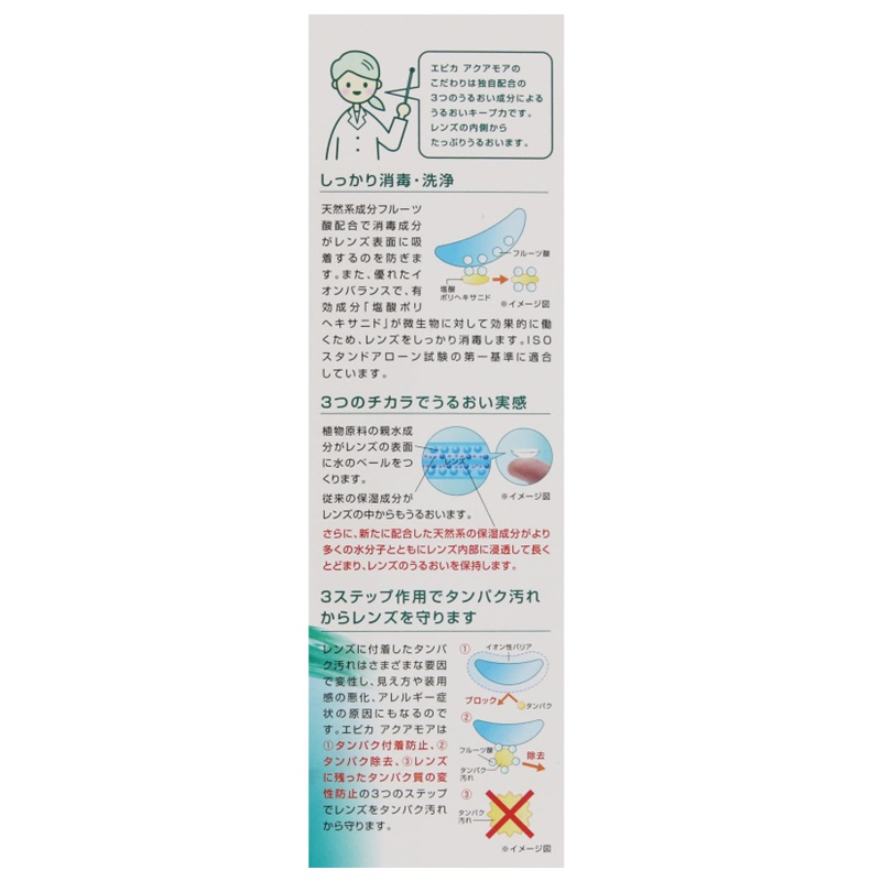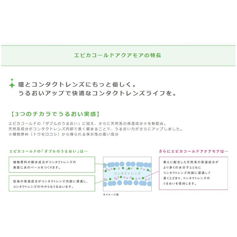 ホウ酸フリーで大事な瞳をいたわり、天然系保湿成分がレンズの内部にとどまり、涙を永くひきつけたっぷりうるおいます。