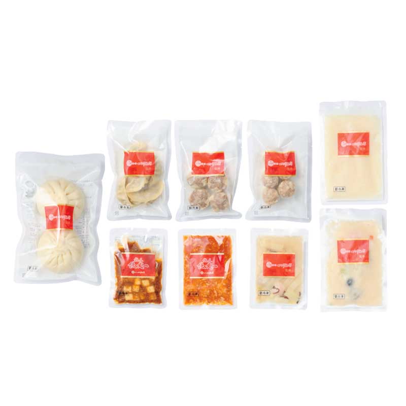 手包み餃子5個入175g、手包み肉焼売4個入160g、貝柱入焼売5個入150g、