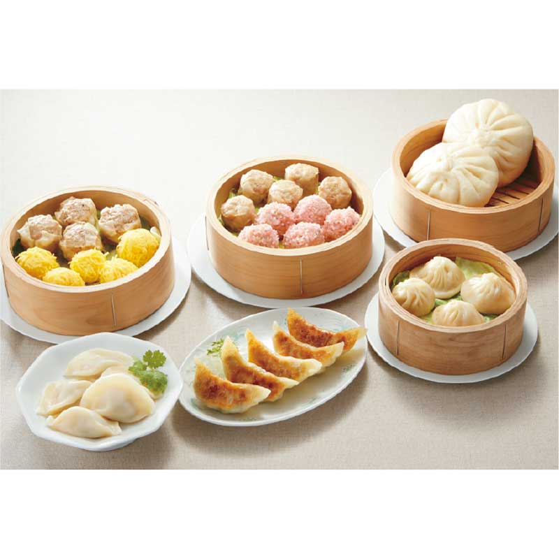 手包み餃子5個入175g、手包み肉焼売4個入160g、貝柱入焼売5個入150g、手包み肉まん2個入240g、