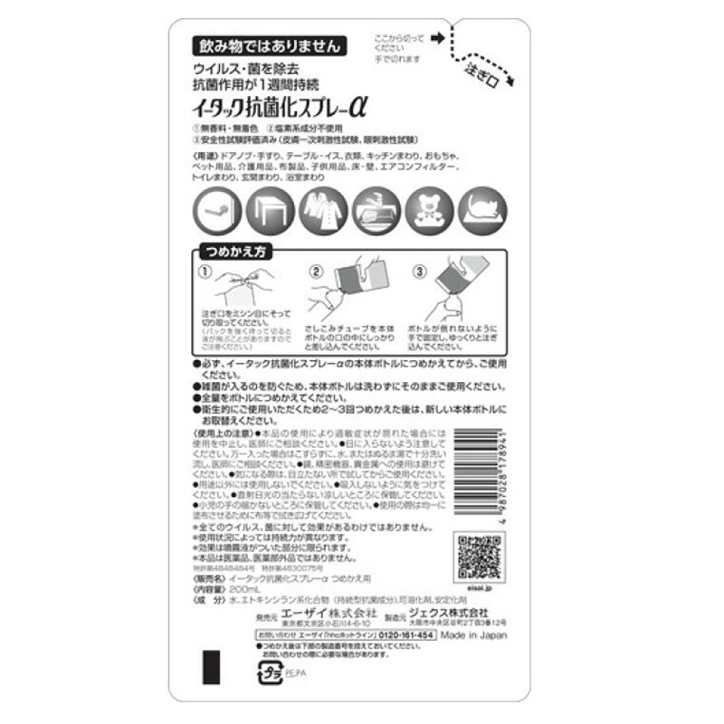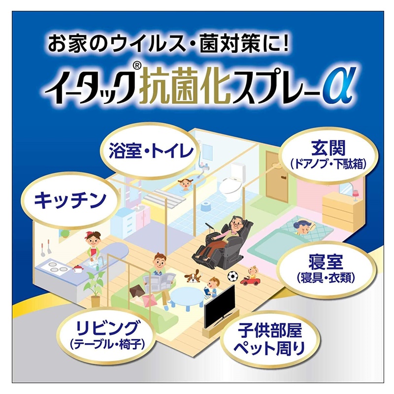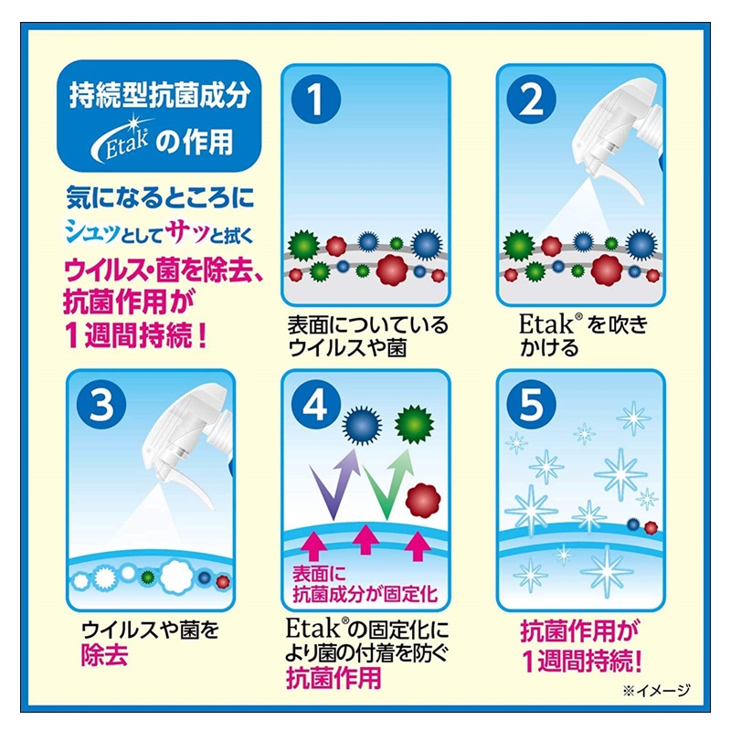 ドアノブやテーブルなど、気になるところにスプレーすることで、EtakR(持続型抗菌成分イータック)により
