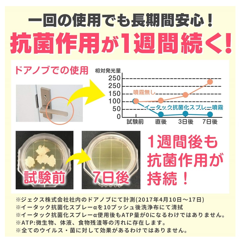 EtakR(イータック)は抗菌成分が対象物表面に固定されるため、スプレーした直後の抗菌作用だけでなく、