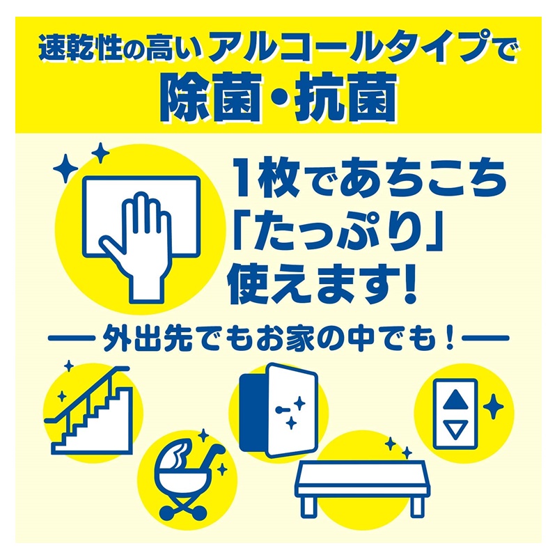 アルコールにより速乾性を高め、外出先のテーブルや車のハンドルなど除菌後すぐに使用したいところにおすすめです。