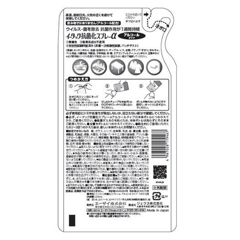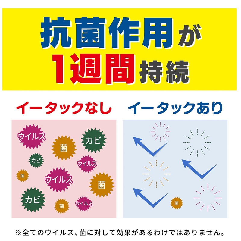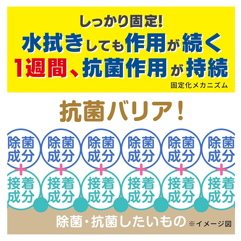 気になるところに「シュッ」として「サッ」と拭くだけで、ウィルス・菌を除去、抗菌作用が1週間持続します。