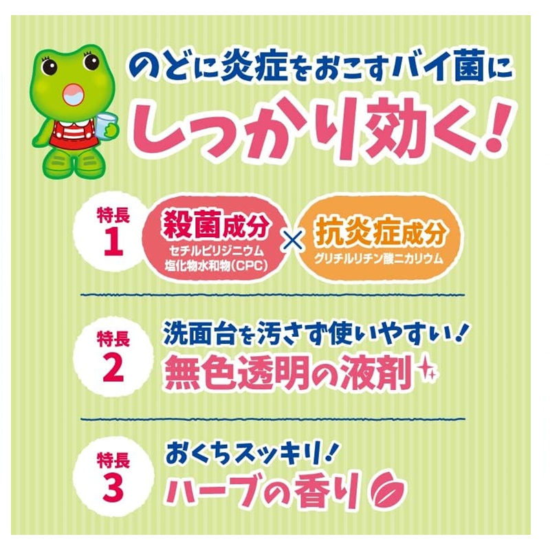 殺菌成分(セチルピリジニウム塩化物水和物(CPC))抗炎症成分(グリチルリチン酸二カリウム):のどに炎症をおこすバイ菌に