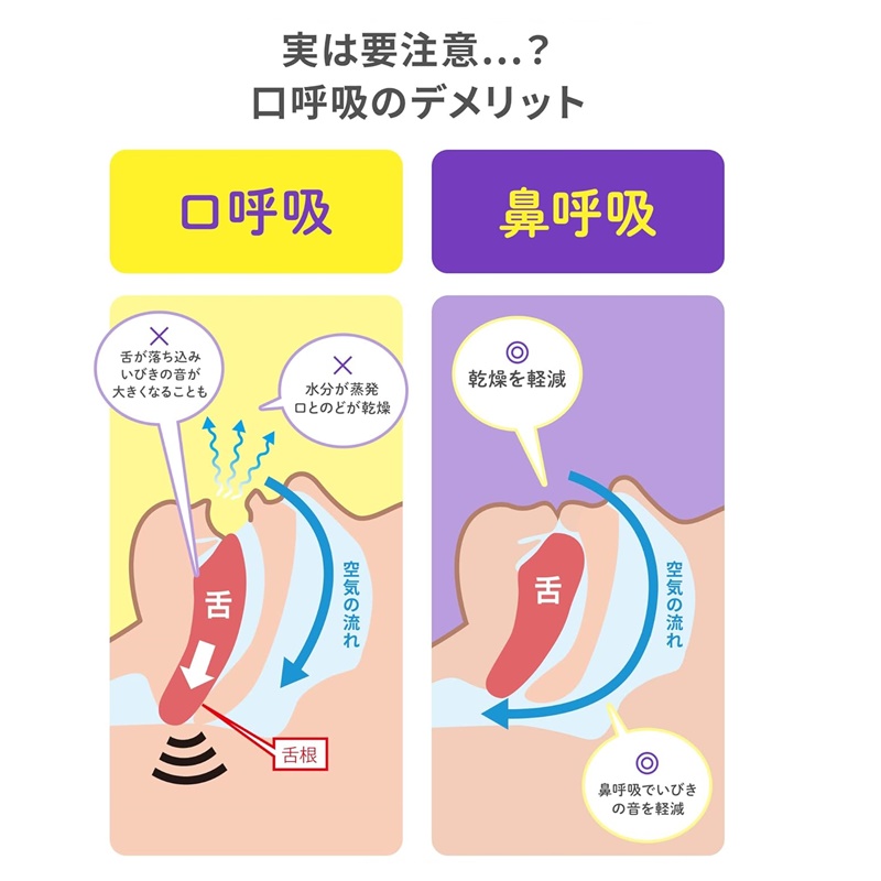 鼻呼吸に誘導し、口・喉の乾き、いびき音を軽減、安眠へ促します。