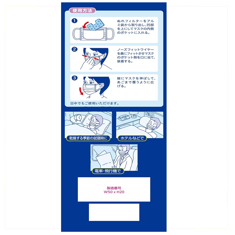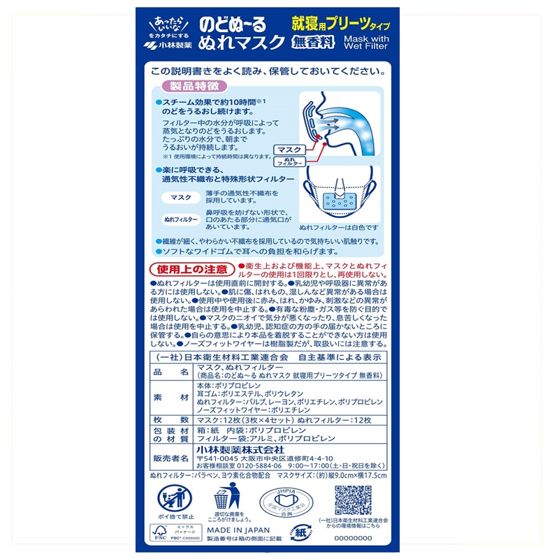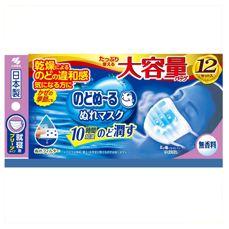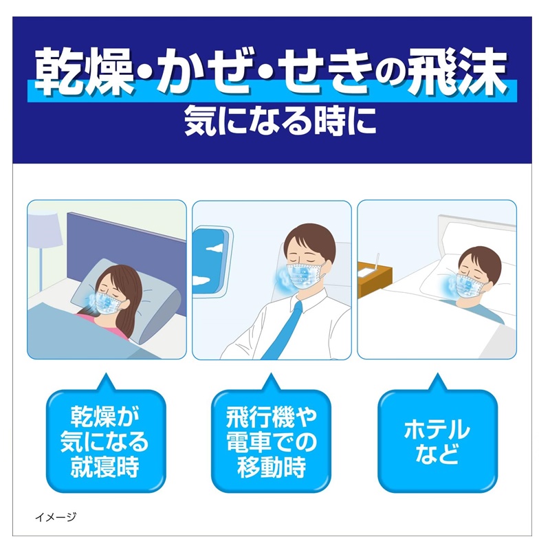 寝ている間、ぬれフィルターによるスチーム効果でのどにうるおいを与えるマスクです。