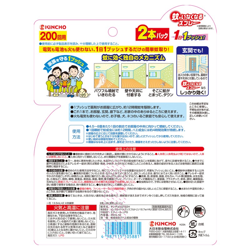 - ●有効成分…ピレスロイド(トランスフルトリン16.7w/v%)(原液100mLあたり)●その他の成分…エタノール、LPG
