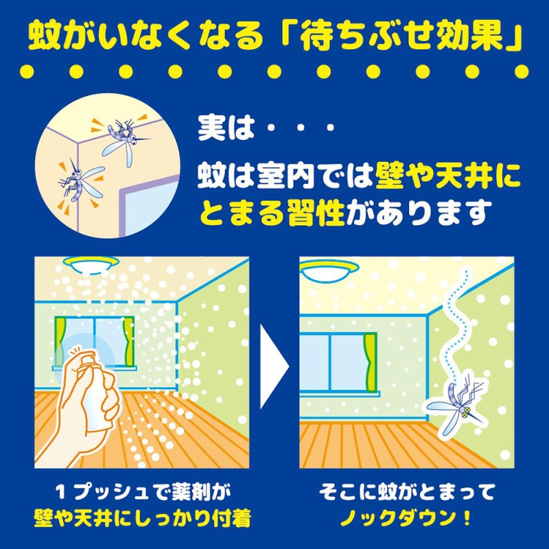 ●4.5~8畳に1プッシュするだけで、壁や天井に薬剤が付着し、そこにとまった蚊を駆除します。