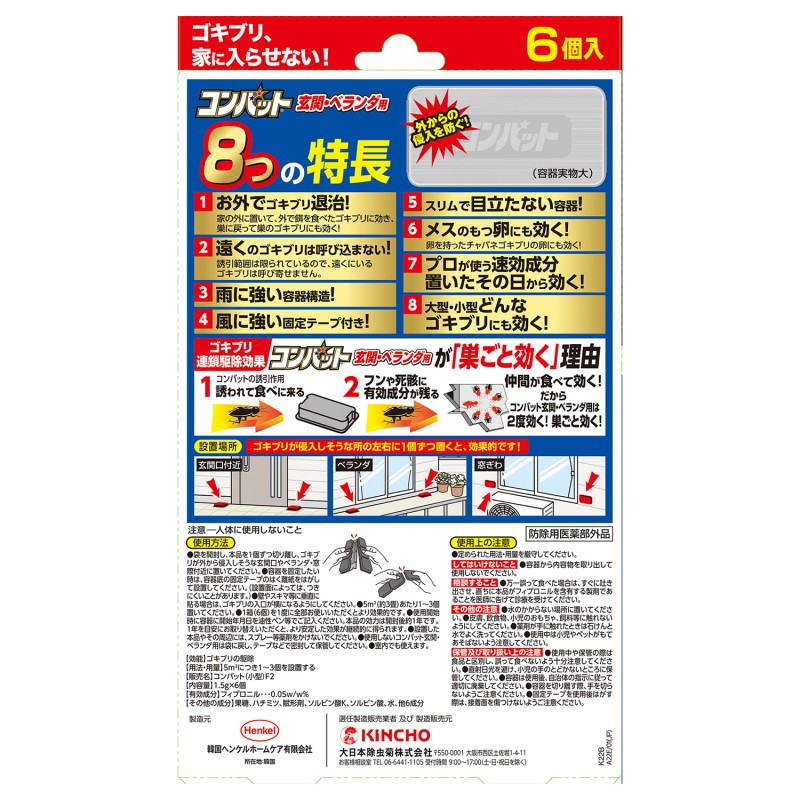 。(4)風に強い固定テープ付き。(5)スリムで目立たない容器。(6)メスのもつ卵にも効く、卵を持ったチャバネゴキブリの卵