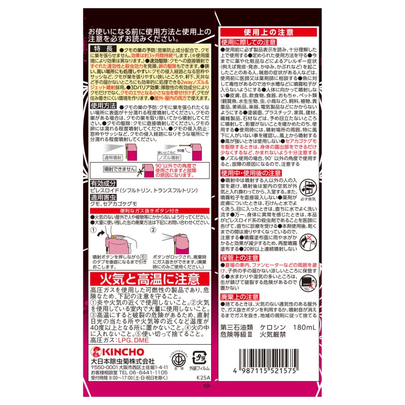 ●速効駆除…クモへの直接噴射ですぐれた速効性と殺虫効力を発揮。卵の駆除もできます。